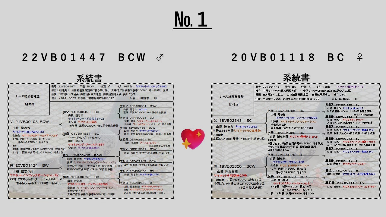| ヤマネット系は日本海沿岸からの乗船に海岸線逃避翔そして放鳩地における帰還方向と海岸導線飛翔及び山谷縦列導線飛翔の逃げ帰りの鳩レースを撲滅!自ら帰る鳩作りに長年専念して参りました。お陰様で数々の史上初のタイトルを手に入れる事が出来ました。鳩レースに歴史無し!実距離優性飛翔ヤマネット系で結果の分かる新しい真の鳩レースに鳩作りを楽しみませんか |