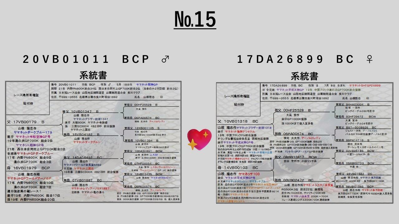 | 備考: | 25年生まれ♂♀在舎確認願います 併せて25年秋RG300K記録鳩あり在舎確認願います |